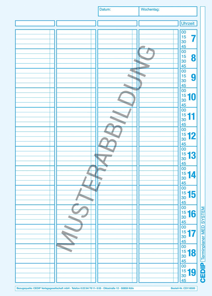 Der Tag wird auf einer ganzen Seite abgebildet. Durch die datumsneutrale Produktion können Sie jederzeit im Jahr mit dem Terminplaner starten. Nutzen Sie die 4 Behandlungsspalten pro Tag und Zeiteinheit: 7:00 - 20:00 Uhr im 25-Minutentakt.